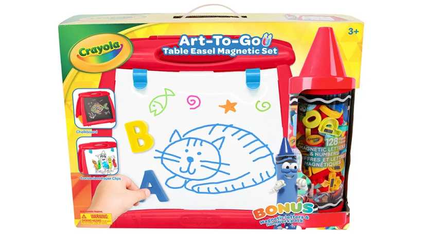9. Crayola Art-To-Go Table Easel Magnetic Set Play at home or travel with this double-sided easel that includes a magnetic dry-erase board, a chalkboard, and a storage nook for supplies. The crayon tube stores the magnetic letters and numbers. Age: 3+, $33, Grow-n-up.com.