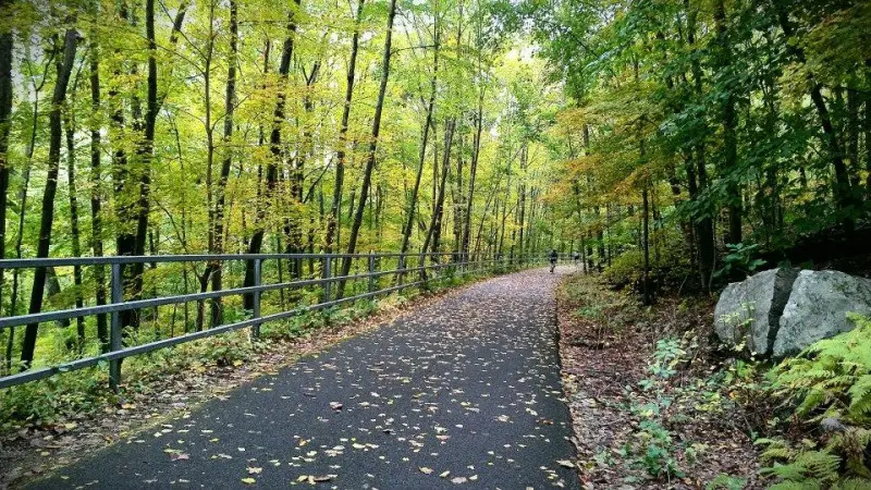 While not technically a “rail-trail,” this bikeway is a 4.9-mile scenic trail along the Hudson River. Stick to the southern half of the trail, which is flat and runs along the river at sea level (paved in asphalt and gravel). It is wheelchair accessible from the parking lot at Nyack Beach State Park. There is a paved connection to the Rockland Lake State Park area from this trail.