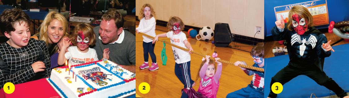 1. Nothing says “gymnastics bash” like an all-hands-on-deck game on the mat after a day on the bars! 2. Melanie’s balance beam skills are off the charts. Do we spy an Olympic hopeful? 3. With all that exercise, the birthday girl’s more than ready to dig in with Mom and Dad. Photos by Andrew Schwartz (wix.com/gadgetandrew)
