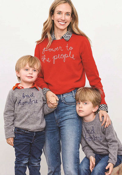 Now, the business is flourishing with custom options, clever phrases (many reflect the current political climate like “Power to the People,” “Bad Hombre,” and “Science Not Fiction”), and mini sweaters for children so that moms and kiddos can coordinate. All sweaters are 100 percent cashmere and hand-embroidered in NYC.