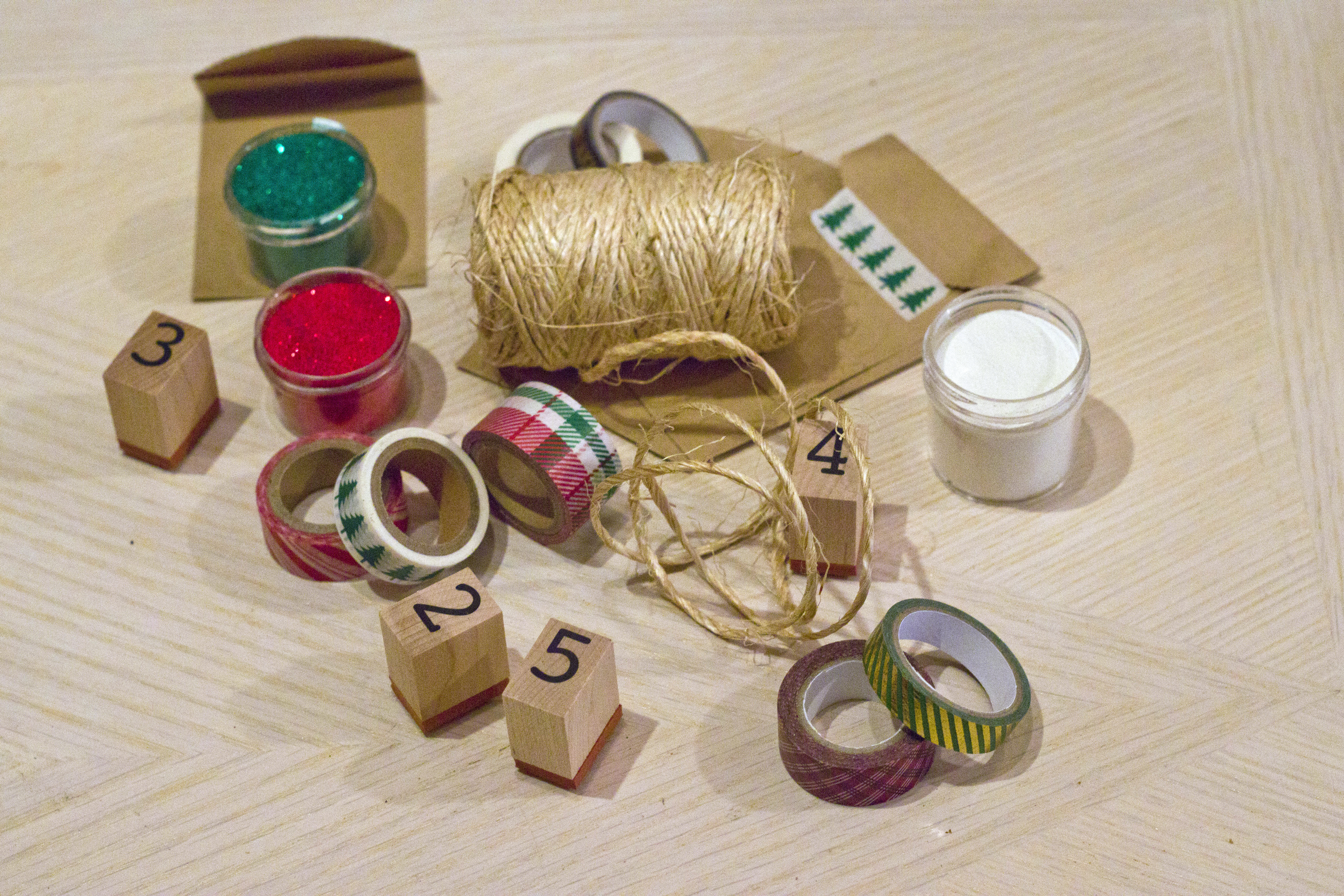 Step 1: Before you fill and seal your envelopes with Washi Tape, you’ll want to emboss your numbers on. Count out the number of envelopes you’ll need (either 25 or eight), plus a couple extra in case you want to practice. Use the inkpad to stamp the desired number on the envelope.