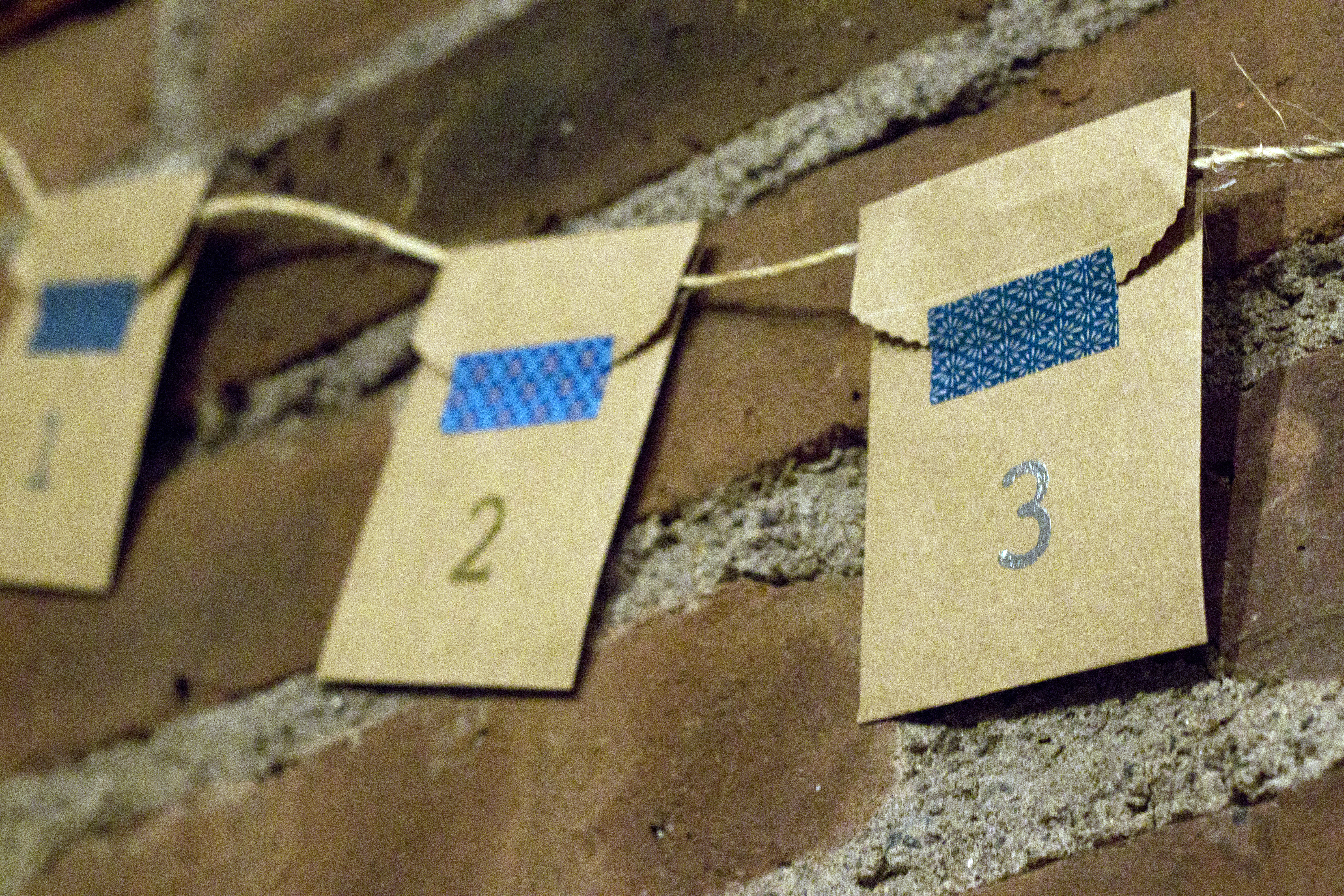 Step 6: Once you’ve stamped, embossed, filled, and sealed all your envelopes, thread your twine under the crease of the envelopes. We did five strands with five envelopes each for the advent calendar, and all eight on one for the Hanukkah counter, but you could divide the numbers differently depending on the space you’re working with.