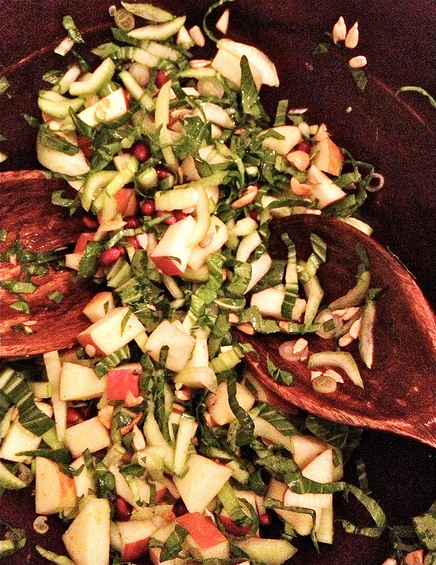 Combine bok choy, apples, scallion, and greens in a bowl.