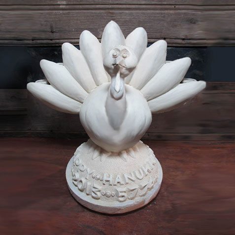 The Menurkey: Upon learning that Thanksgiving and Hanukkah fall on the same day this year, a creative 9-year-old named Asher invented the concept of a Menurkey: an innovative menorah which holds its candles inside of splayed turkey feathers. The young New Yorker began by raising money on Kickstarter until he could make his design is available online. The Menurkey is also customizable–so break out your acyclic paints and make it a craft night for the family! $50, moderntribe.com