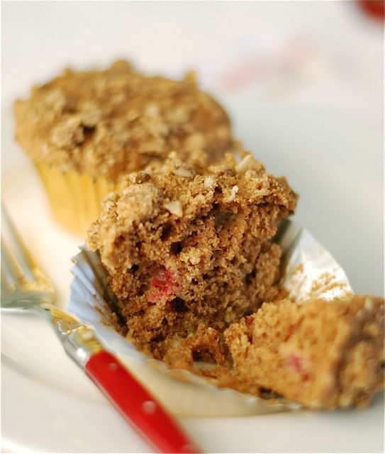 - For the topping, mix the dry ingredients together in a bowl, then add the vegetable oil and milk and pinch everything together with your fingers until pebbles form. Drop the topping evenly on the muffins.