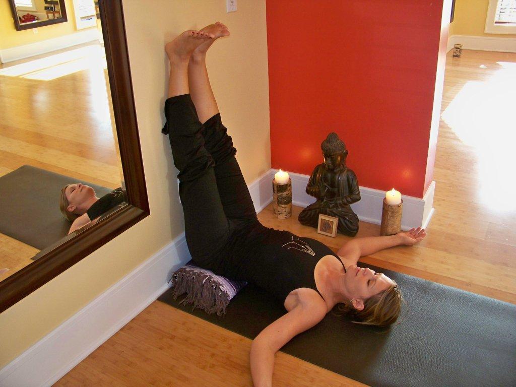 We yoga students were lying on our backs, our derrieres pushed up against the pale lemon walls, our legs long and extended up the wall, and our backs flat on our mats. For added comfort, many of us had pillows placed under our lower backs or underneath our heads. This pose, known as Legs Up the Wall, is a restorative rather than an one–and is said to aid with a slew of unwanted symptoms ranging from menstrual cramps and lower back pain to sore feet and legs and, the biggie, insomnia.