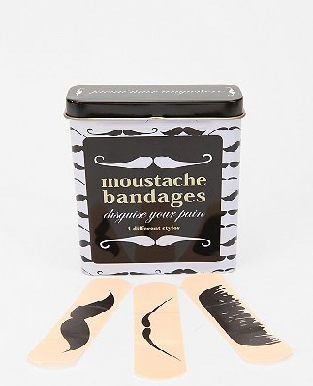 set comes with 4 different mustache styles on 25 band aids. $7, urbanoutiftters.com