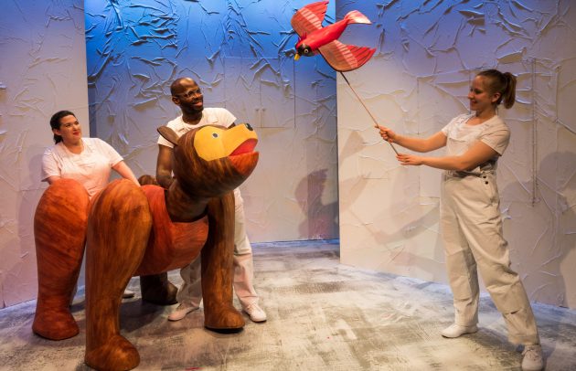 Feeling confident that my little girl was well acquainted with the stories ahead of time, I then started to think about the show experience itself. I wasn’t sure she’d “get” the idea of watching a performance on stage. We don’t watch much TV at home and she’s more likely to run around the room or mess around with her friends during music class than sit and watch the teacher play guitar. I also wondered how she’d feel about being in a dark theater full of strangers. To my relief, the DR2 Theatre was small and welcoming and we felt right at home. Of course, my two-year-old didn’t want to sit in her seat by herself, but she was still as a statue in my lap from the moment the action began.