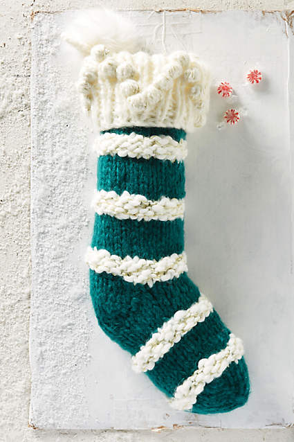 Decorate with the traditional colors of Christmas. These Popstripe stockings, available locally at Anthropologie stores, come in green, red, and white and have a chunky striped design that resembles a Peppermint. Each stocking also has a loop and snowball on top. $48, anthropologie.com -