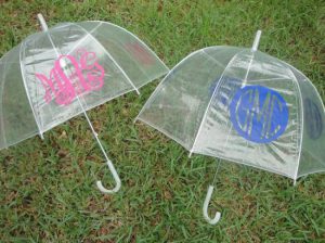 For the pint-sized prepster: Think preppy classics need be put away just because summer has come and gone? Think again. Send your kids to school with cheerily monogrammed umbrellas from Paisley & Polka Dots. No chance of getting these clear cuties mixed up in the coat room, and the forecast is sure to be fashionable with a chance of cute!