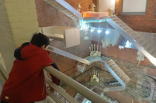 The first thing kids gravitate toward when they enter the museum is Samora Golden’s The Flat Side of the Knife. Located on the first floor, immediately to the left of the lobby, this reflective exhibit extends twice the height of the Duplex Gallery and captures the attention of kids by displaying familiar objects. Metal wheelchairs roll up and down stairs to rooms with plants and guitars, leading down to the ground floor with couches, with a backdrop of a stone crescent moon. Museum visitor George Chudley, 11, says he thinks it’s cool how the rooms are all connected and the stairs lead to the instruments, couches, and beds.