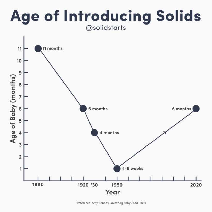 Starting solids is confusing for good reason: the rules of the game have changed — a lot. According to Amy Bentley’s book “Inventing Baby Food,” in 1880, the average age of starting solids was 11 months old. Processed baby food gave rise in the 1920s, and by 1950, the average age of starting solids fell to mere 4-6 weeks old.