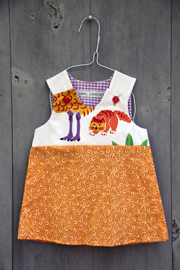 Carol Schneider’s dresses are sweet and simple. She carefully culls her fabrics from subtle, retro tablecloths and curtains infused with striking, vintage florals. I love this funny ostrich and tiger dress, looking as though it was pulled from a 1950s Golden Book illustration. 100% upcycled and designed to grow with your girl through the years: from dress to smock to top.